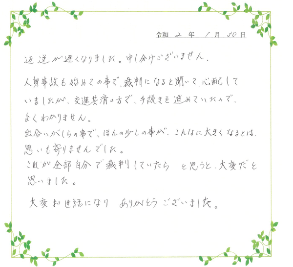この度は大変お世話になりました。どうもありがとうございました。 約2年間相手保険会社と交渉いただき納得のいく結果に満足しております。また、途中経過を何度も封書にてお知らせ頂き安心してお任せ出来ました。 誠にお世話になり有難うございました。 |