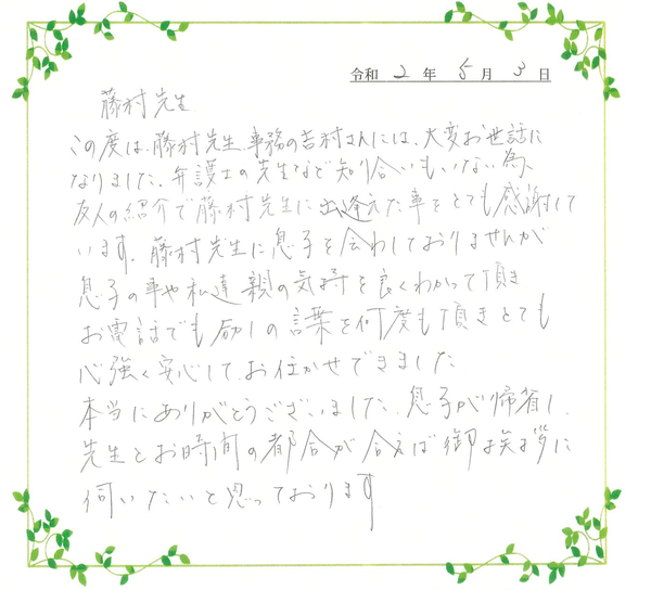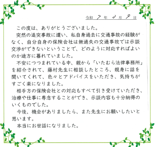 | この度は私が起こした交通事故の裁判の件で藤村先生及びいたむら法律事務所のスタッフの皆様ありがとうございました。 |