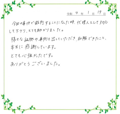 この度は民事の訴訟にご尽力いただき誠に有難うございました。生にて初めての提訴にただビックリ落ち着かない日々が続いてましたが先生方からの電話で安心することが出来大変心強く思いました。無事円満に解決していただき改めて感謝申し上げます。 今後の先生方のご活躍とご健勝をお祈り申し上げます。 |