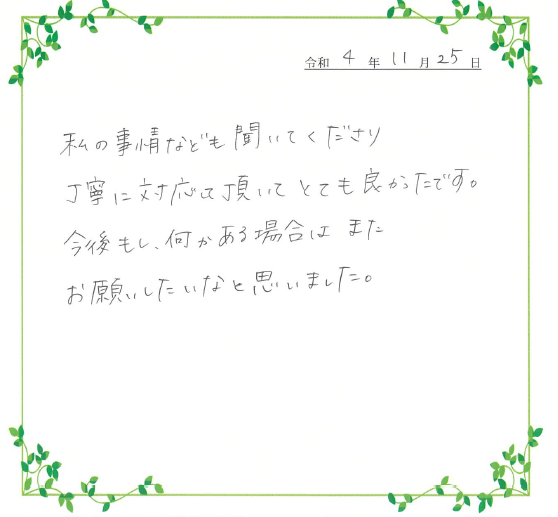 この度は大変お世話になりました。 今回のような事は初めてで、不安もあったのですが、分からない事もとても丁寧に分かり易く説明していただき、納得して今回の件を終える事が出来ました。 |
