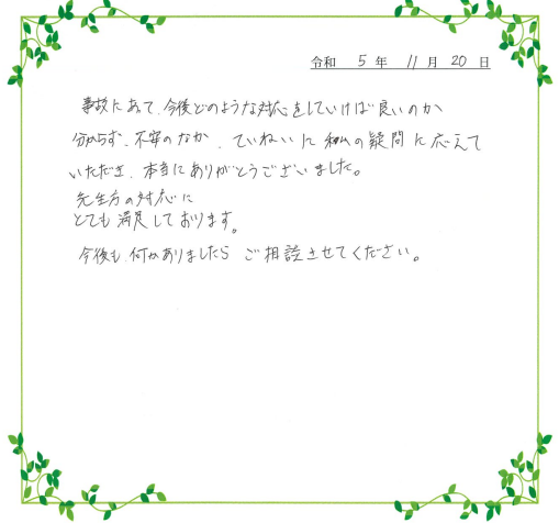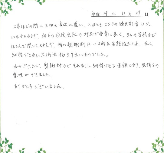 このたびの事故の件では、大変お世話になりました。相手の方が、一筋縄ではいかず、私はとても悩みました。しかしながら、先生方の交渉により解決できたことに満足しています。 ありがとうございました。 |