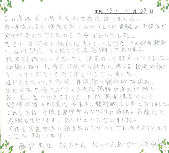 母が亡くなった当初は,事故後の精神的な痛み,不自由な生活,その他の大きな傷跡や痛みが残り辛い思いをかかえておりましたが,無事満足のいく賠償内容の結果に今は少し精神的にも楽になりました。 これもみな弁護士事務所のスタッフの皆様のお陰だと感謝しております。 藤村先生,松山さん,たいへんありがとうございました。 |